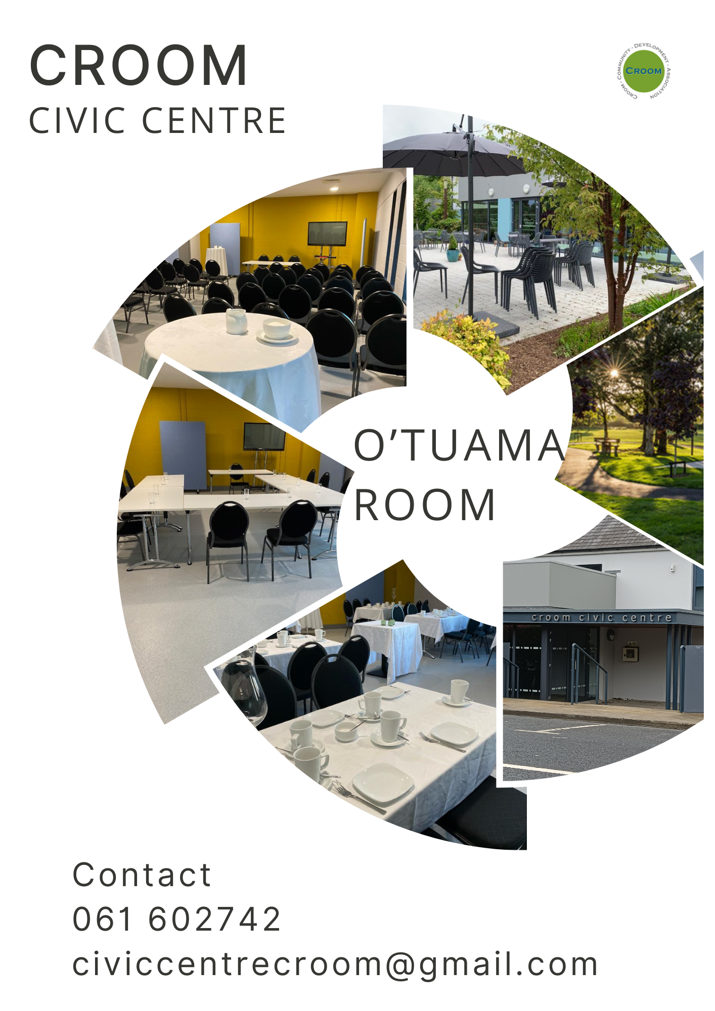 From the Main Street the entrance to the Civic Centre opens on to Croom Town Park. Through careful planning and much enthusiasm, CCDA and the community of Croom developed land in the centre of the town in to Croom Town Park. The Civic Centre is a great addition to the park and to the town offering, the following facilities